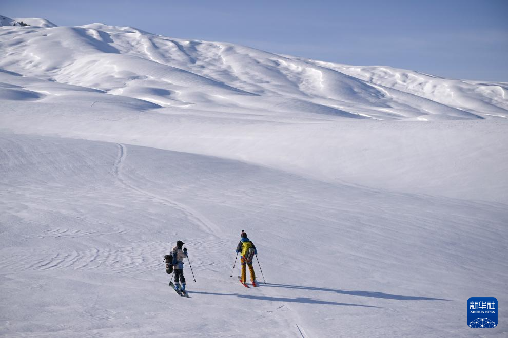 在新疆伊犁河谷东部山区,为获得理想风力,程鹏(右)和同伴背着装备,踩着滑雪板向更高的山坡行进(3月15日摄)。