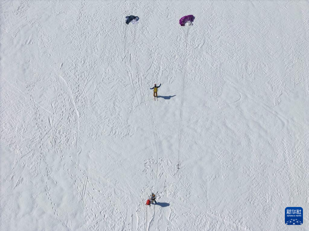 在新疆伊犁河谷东部山区,程鹏(上)在滑行前帮助同伴整理风筝(3月14日摄,无人机照片)。