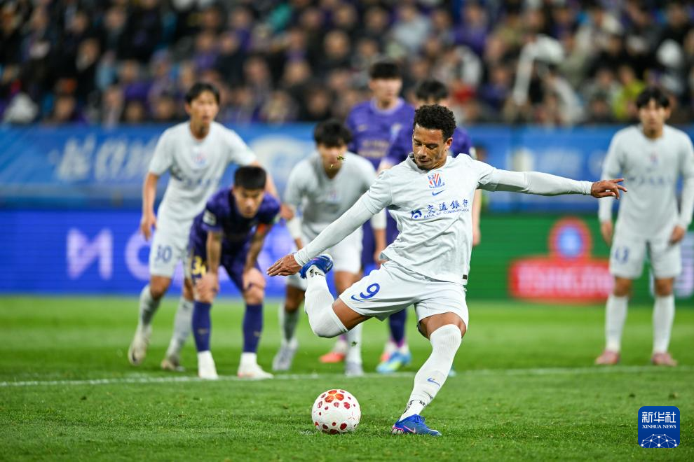 4月5日,上海申花队球员拉唐在比赛中点球进球。