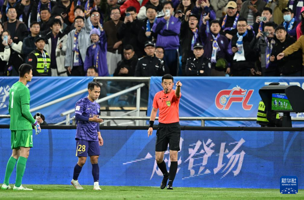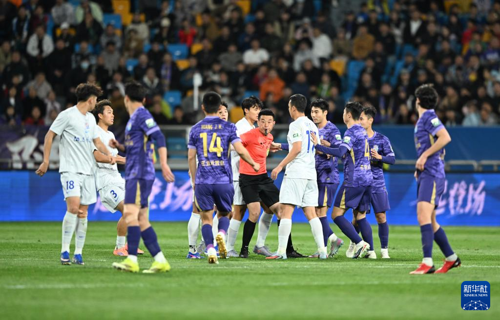 4月5日,主裁判何鑫(左)在下半场判给上海申花队一粒点球。