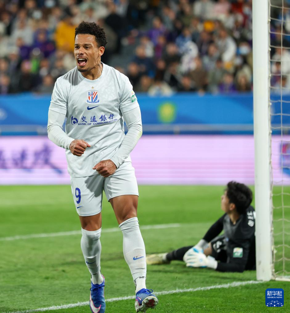4月5日,上海申花队球员拉唐(左)在比赛中命中点球后庆祝。