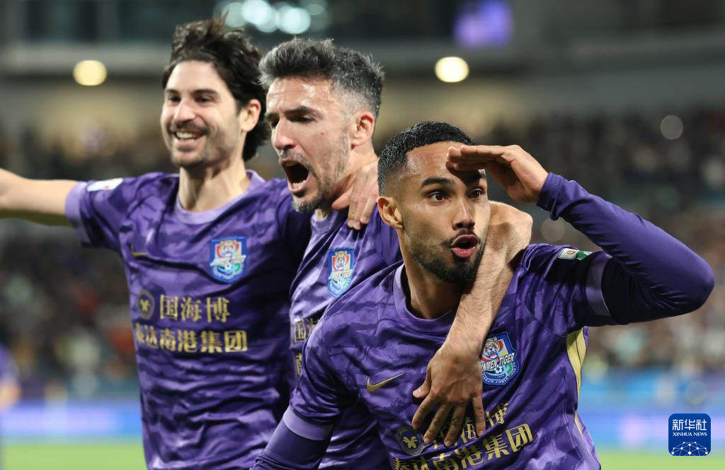 4月5日,天津津门虎队球员豪梅·格劳(左)、基莱斯、谢蒂内(右)在进球后庆祝。