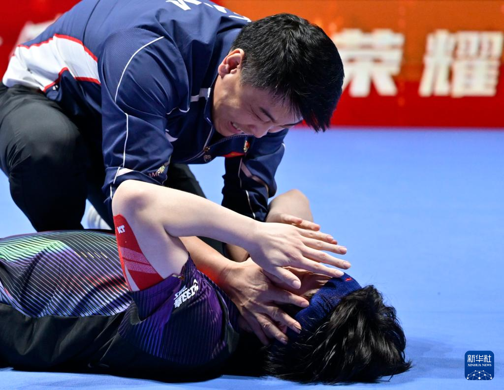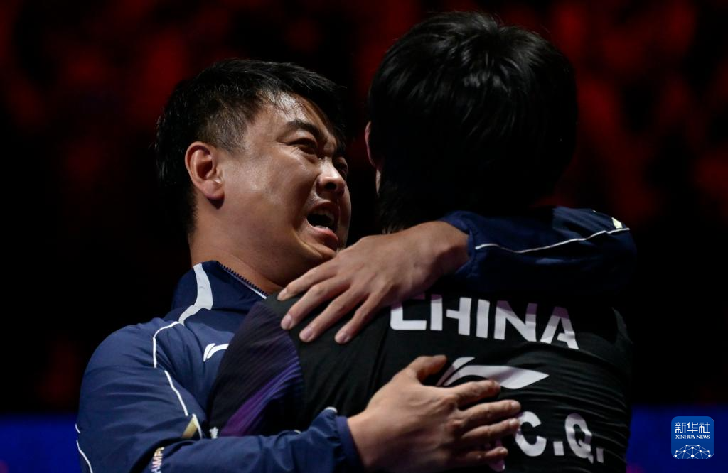 4月5日,中国选手王楚钦(下)在赛后与教练王皓庆祝胜利。