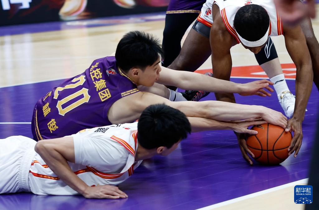4月4日,北京控股队球员江林俊(上左)与深圳马可波罗队球员卢鹏羽(下)、阿立兹·约翰逊在比赛中争抢。