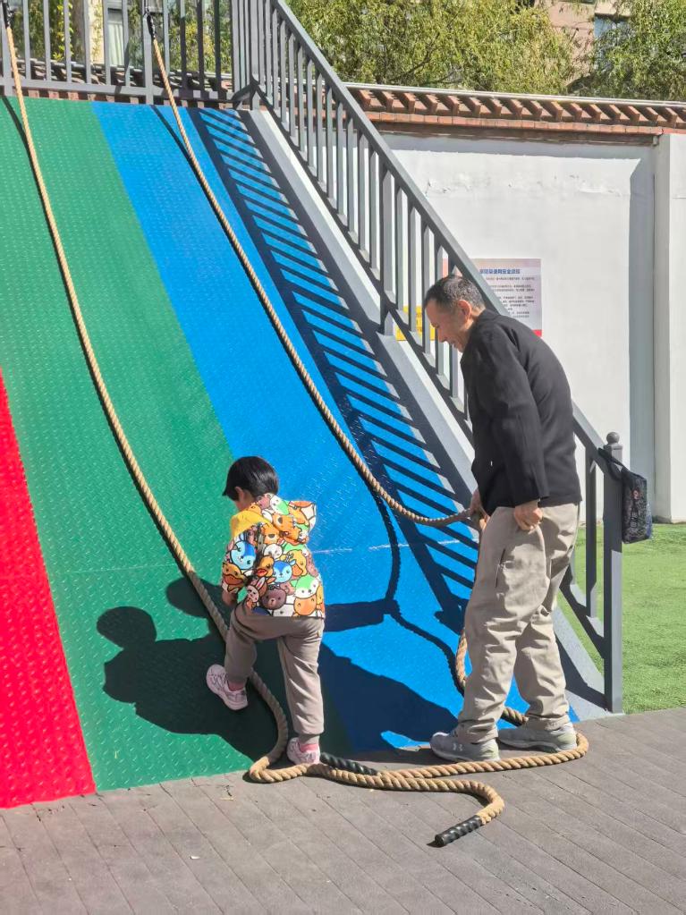 一位小朋友在家长的陪伴下尝试攀爬架