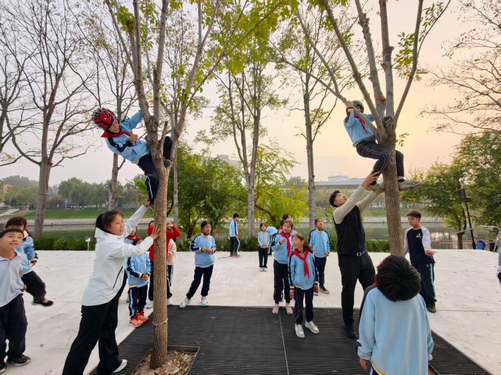 丰台区外国语学校的学生在学校附近的公园里上爬树课