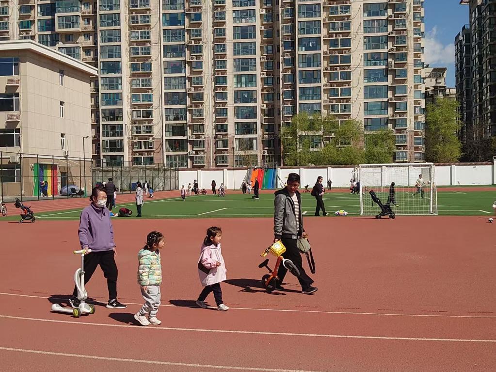 4月6日,住在学校附近的孩子和家长在丰台区外国语学校的操场上活动