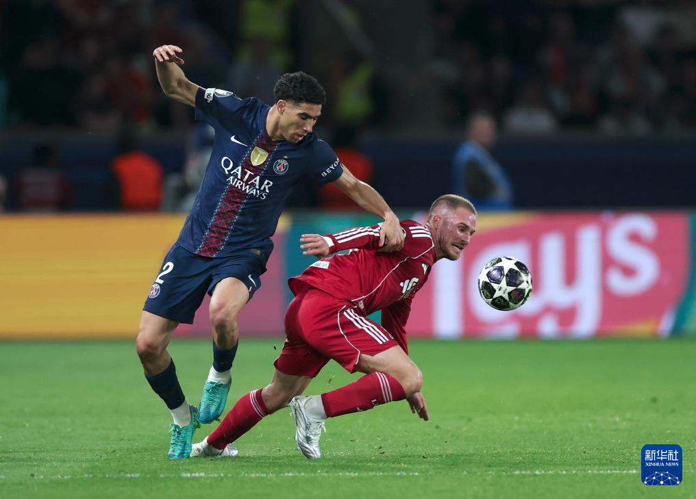 4月8日,巴黎圣日耳曼队球员阿什拉夫·哈基米(左)和利物浦队球员麦卡利斯特在比赛中争抢。