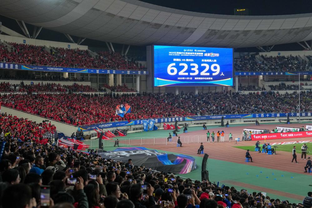 2025年11月1日,在江苏南京举行的2025江苏省城市足球联赛(“苏超”)决赛吸引62329名观众观赛,刷新中国业余联赛上座纪录。新华社记者 李博 摄
