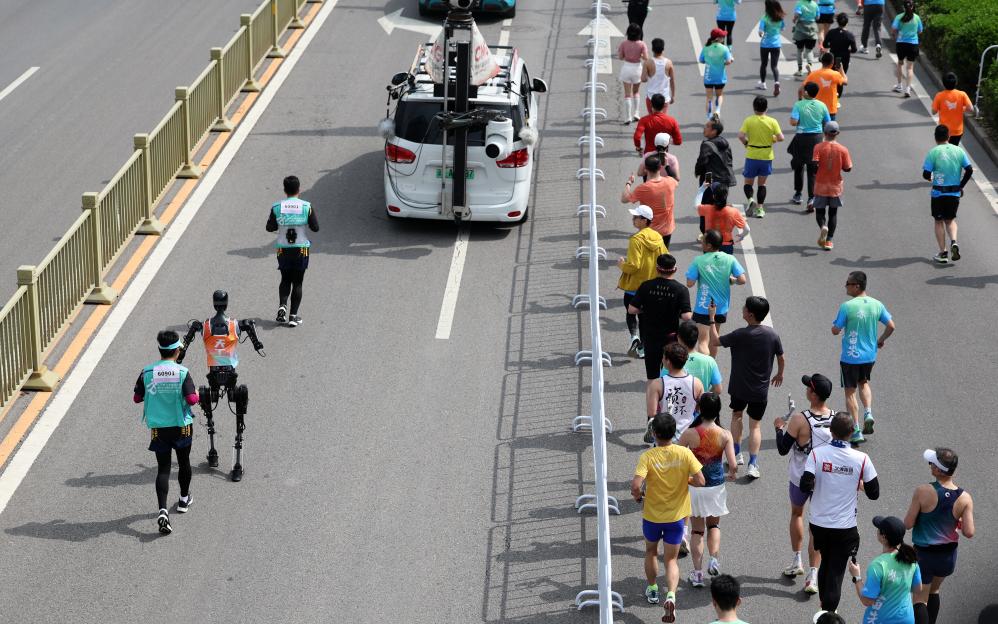 2025年4月19日,选手在北京亦庄半程马拉松暨人形机器人半程马拉松比赛中。新华社记者 曹灿 摄