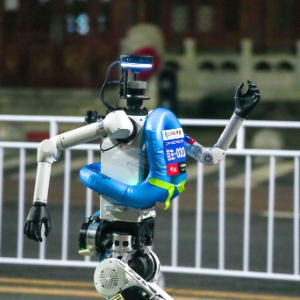 2025年4月19日,参加人形机器人半程马拉松的天工队选手在抵达终点后。新华社记者 李贺 摄