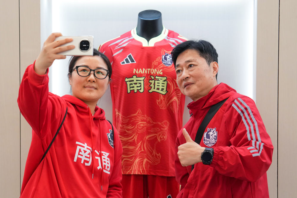 4月11日,两位南通队球迷在常州奥体中心“苏超”球衣展示区拍照留念。新华社记者 李博 摄