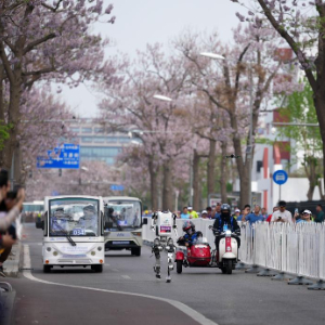 粉色泡桐花树下,一边是人头攒动的跑者,一边是依次起跑的人形机器人,吸引了大量观众前往观看。机器人的外观和表现不一,有的风驰电掣,有的踱步前行,有的高大灵活,有的迷你可爱。有的赛队给自家机器人戴上遮阳帽,有的机器人“满头黑发”,跑起来很“飘逸”……许多人类跑者边跑边拿手机拍摄机器人“同行”。