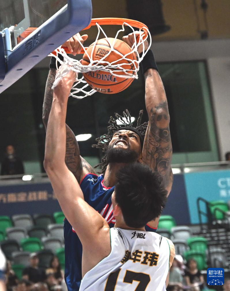 4月21日,香港金牛队球员所罗门(上)在比赛中扣篮。