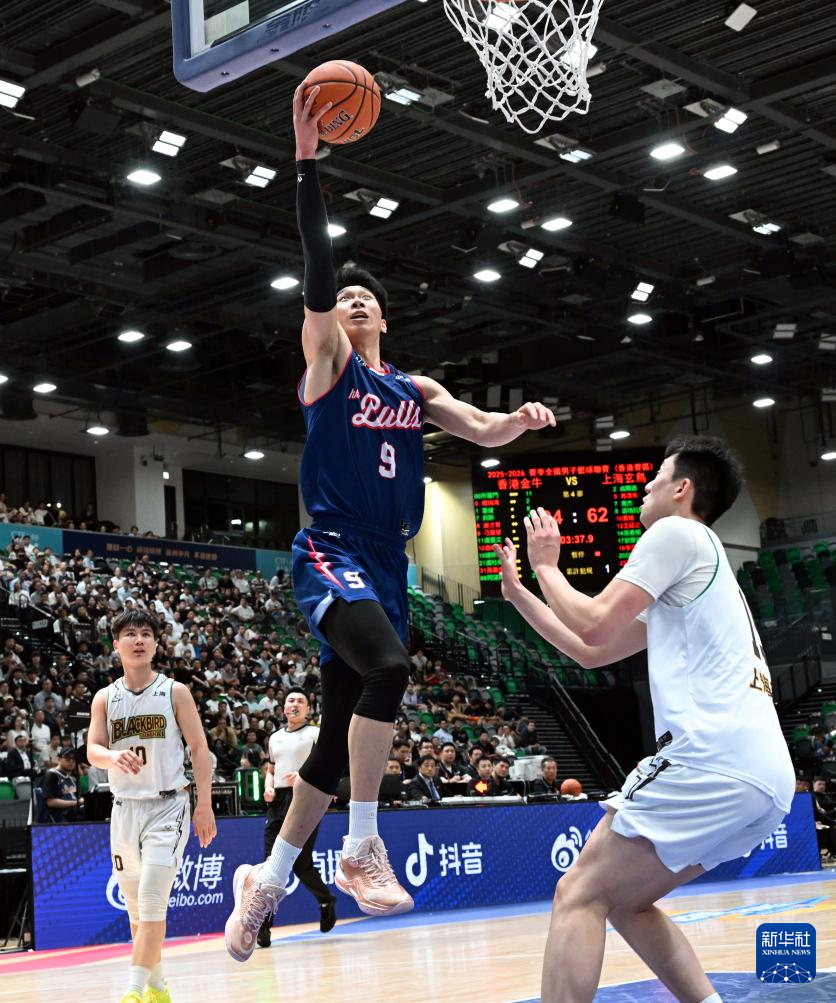 4月21日,香港金牛队球员刁展望(上)在比赛中上篮。