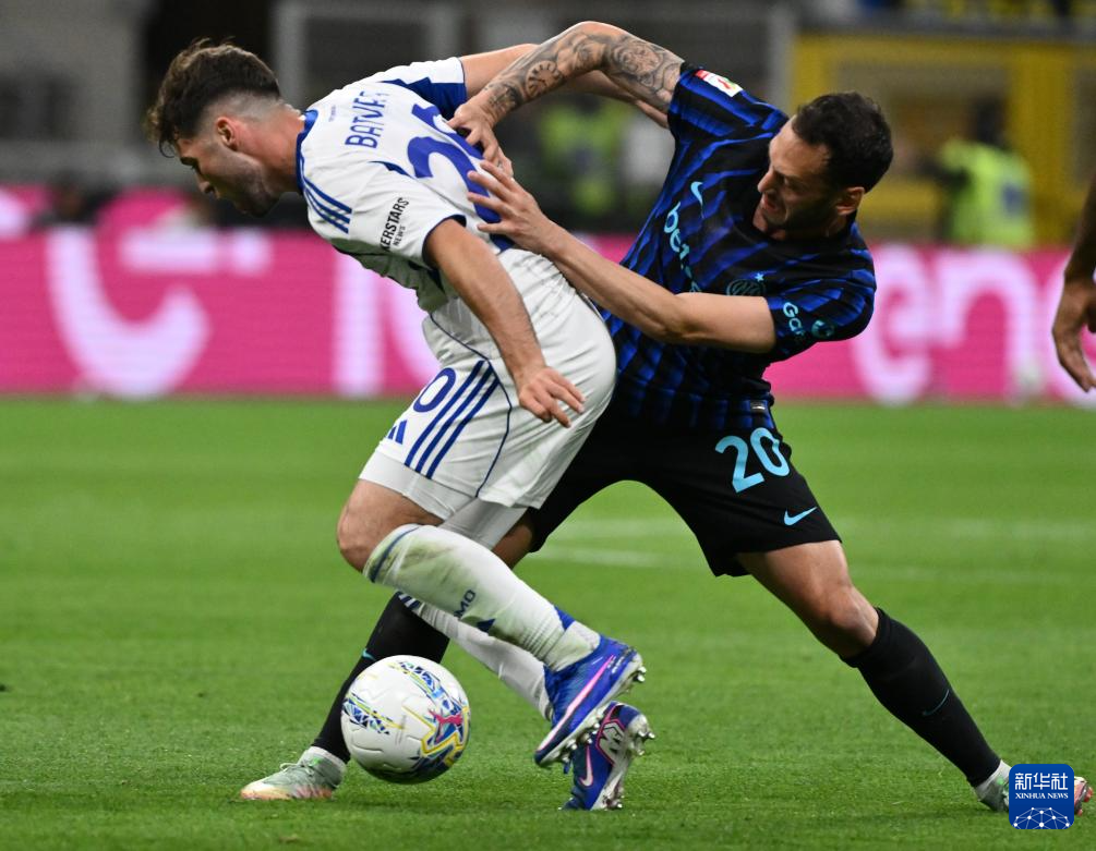4月21日,国际米兰队球员恰尔汗奥卢(右)与科莫队球员巴图里纳在比赛中拼抢。