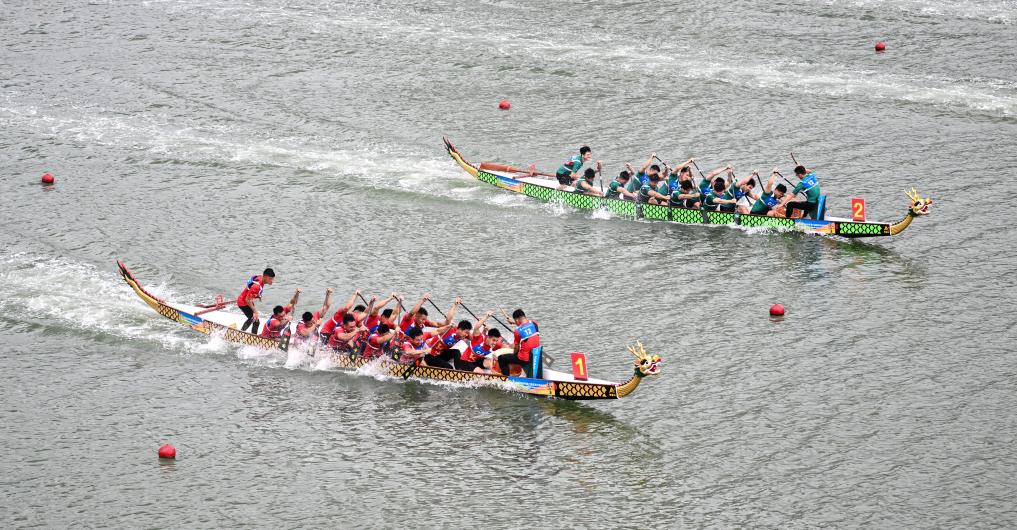 随着裁判一声令下,鼓手身姿矫健,鼓槌如流星般起落,“咚咚咚”的鼓声似战鼓催征,激昂的节奏让人心潮澎湃,而位于船尾的舵手确保龙舟“行稳致远”。
