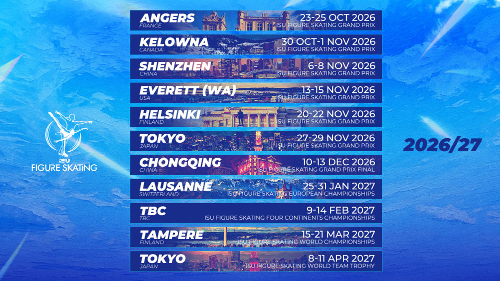 花样滑冰方面,国际滑联大奖赛本赛季将于10月底在法国拉开帷幕,共有7站比赛,其中两站在中国举行,分别在深圳和重庆,其中12月10至13日的成年组和青年组的总决赛都将在重庆举行。