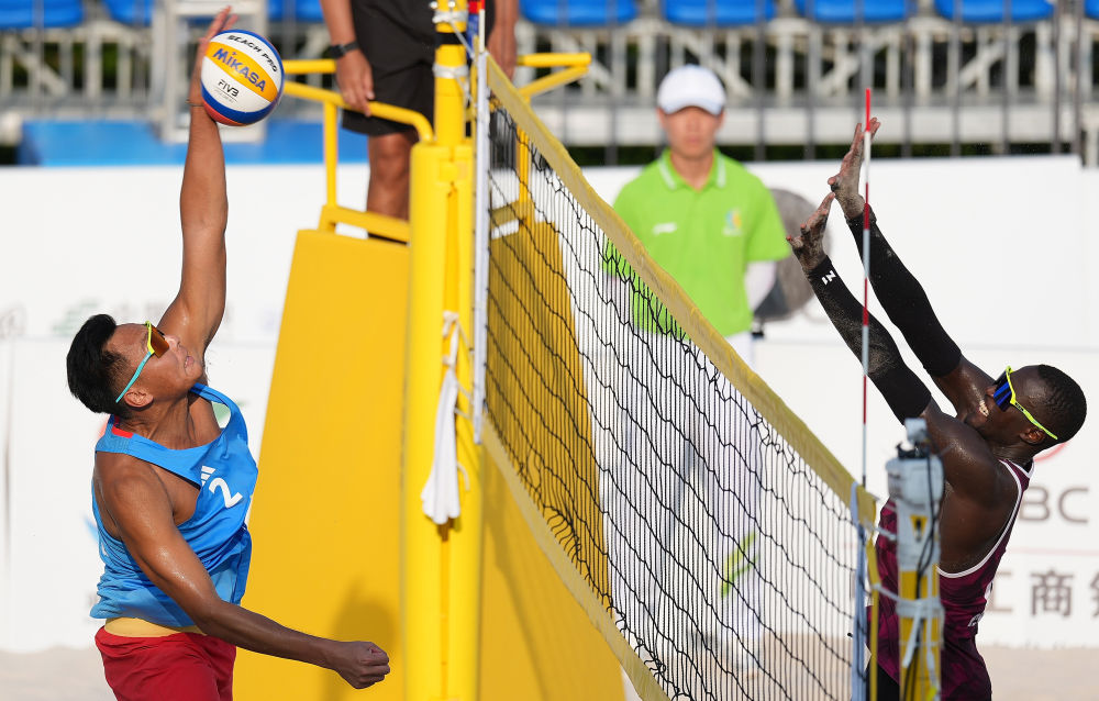 男子四强席位争夺战于当日下午进行。中国队组合张泰/周朝威对阵卡塔尔组合谢里夫·桑巴/艾哈迈德·扬科的比赛中,后者发挥出力量强、弹跳好、扣杀凶、移动快和一传稳的技术特点,进攻手段丰富,攻防转换快。最终,中国队组合以10:21、19:21落败,止步八强。