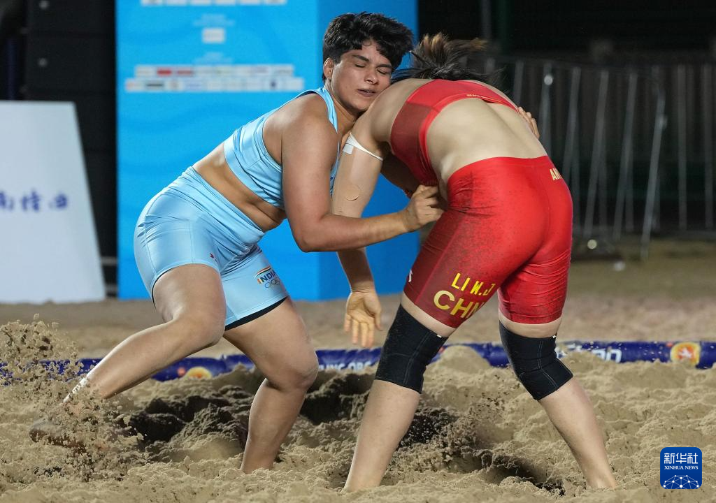 4月28日,在海南三亚举行的第六届亚洲沙滩运动会沙滩摔跤女子70公斤以上级半决赛中,中国选手李文吉不敌印度选手普里娅,无缘决赛。