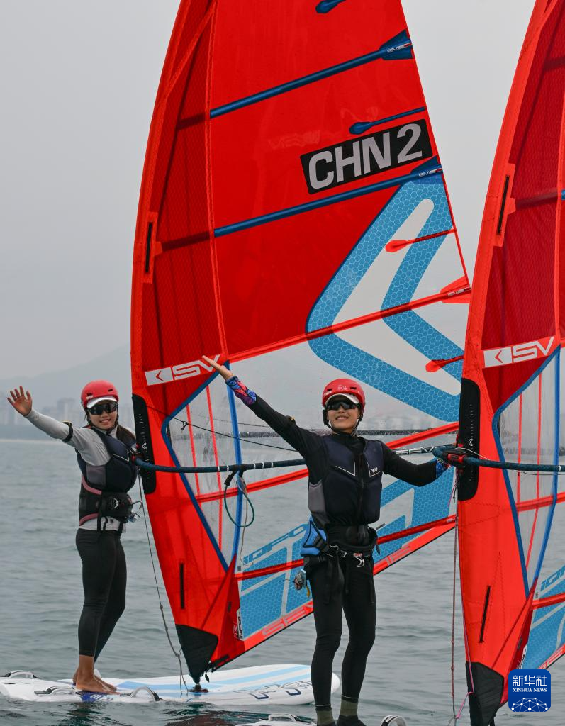 4月28日,冠军中国队选手陈逸敏(右)和季军中国队选手李晴在等待比赛。当日由于风力未达竞赛要求,此前轮次的总成绩即为最终成绩。