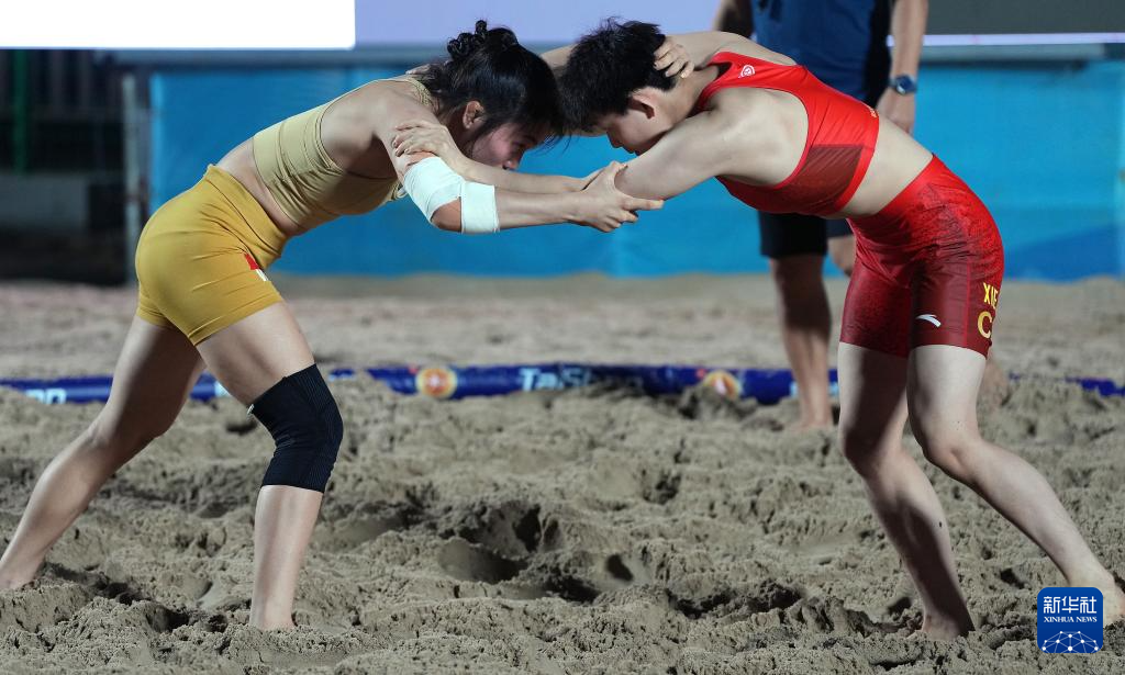 4月28日,在海南三亚举行的第六届亚洲沙滩运动会沙滩摔跤女子60公斤级半决赛中,中国选手谢梦宇战胜越南选手阮氏美幸,晋级决赛。
