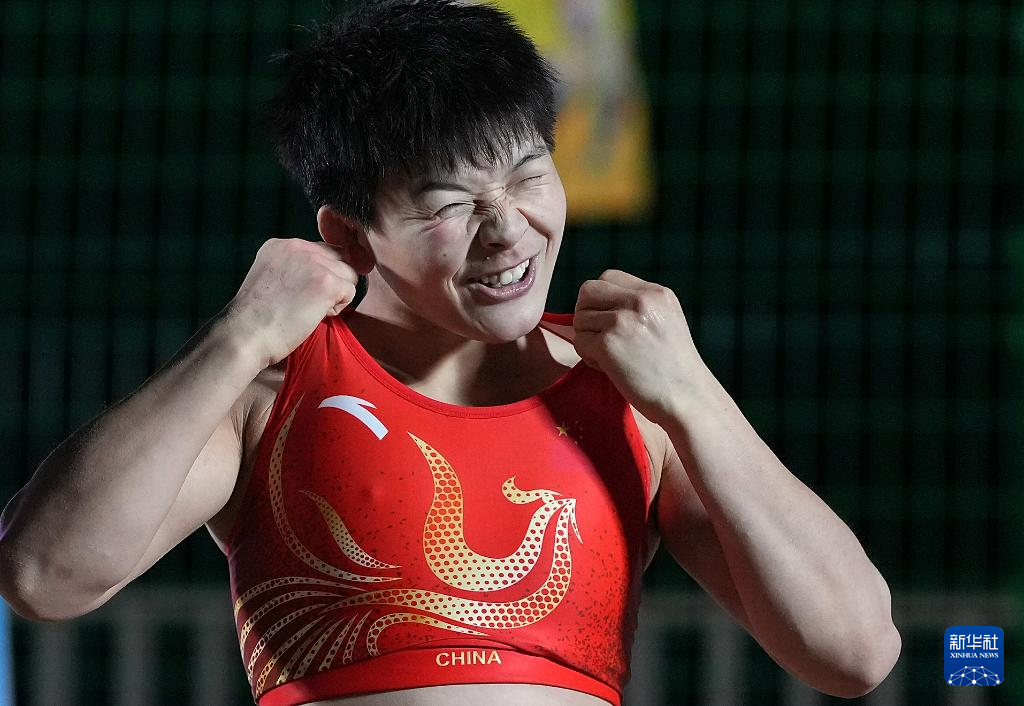 4月28日,中国选手谢梦宇在比赛后庆祝胜利。