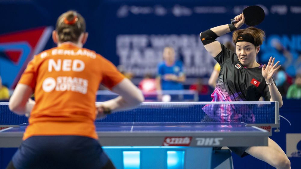 4月28日,中国香港队选手杜凯琹(右)在比赛中回球。她3比1战胜荷兰队选手伊尔兰德。新华社发(史蒂芬·程摄)