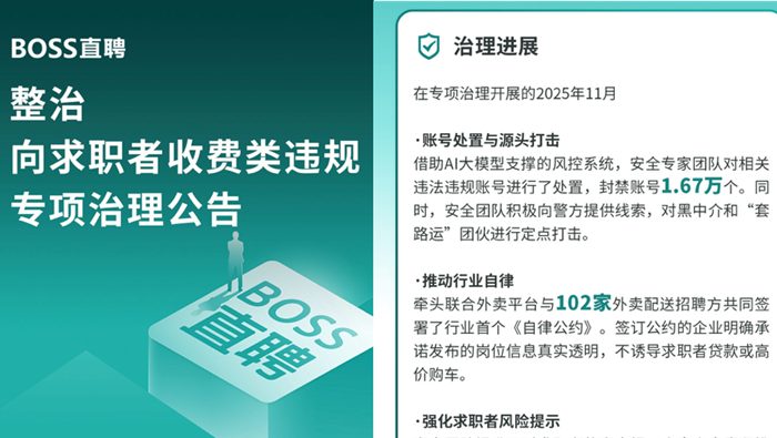BOSS直聘:单月封禁1.67万涉“套路收费”类账号,推送400万次风险提示