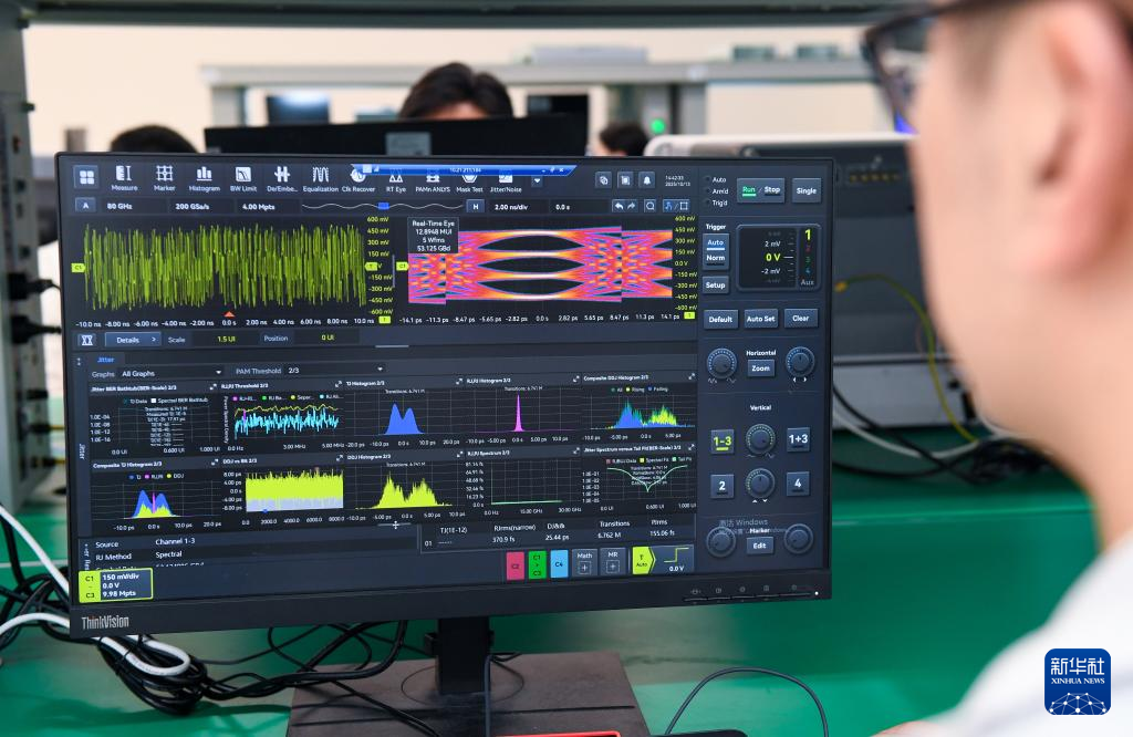 10月13日,在深圳市万里眼技术有限公司,实验室人员进行高速SerDes信号眼图测试。