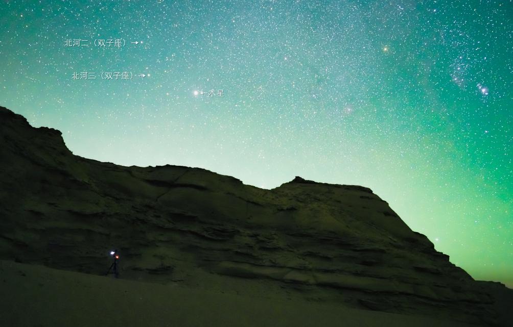 2025年9月23日,在新疆哈密大海道拍摄的被绿色气辉围绕的木星、双子座中的北河三和北河二。(王俊峰 摄)