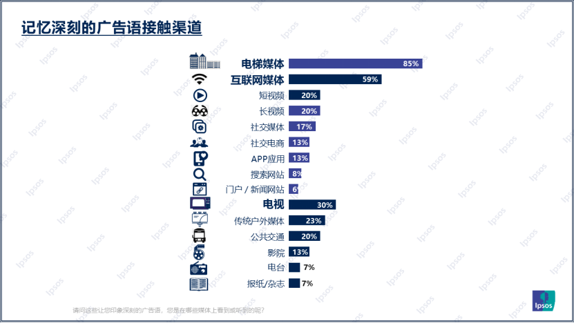 益普索Ipsos的渠道协同数据进一步佐证了这一价值:线上互联网媒体(短视频、社交媒体等)的用户基数庞大,擅长让创意广告语快速破圈;而以分众为代表的电梯媒体以85%的消费者接触占比成为线下记忆载体,其高频次触达为提高品牌识别度和记忆提供了有效途径。