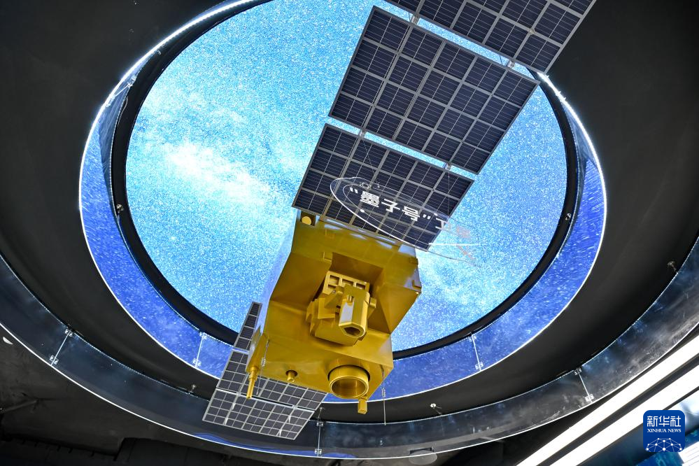 在位于安徽省合肥市的中电信量子信息科技集团有限公司科技体验馆内拍摄的“墨子号”量子卫星模型(2025年7月1日摄)。