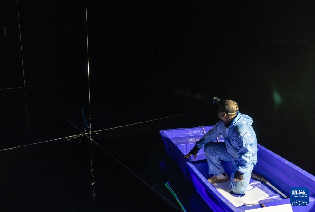 2023年4月21日,在位于四川省稻城县海子山的高海拔宇宙线观测站“拉索”水切伦科夫探测器阵列水池,科研人员坐船更换实验设备。