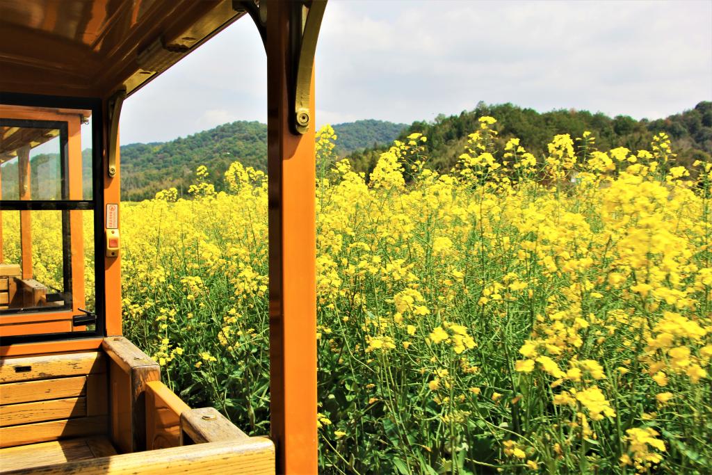 坐在车厢里向外望去,漫山遍野的油菜花随风起伏,如金色的海洋,粉墙黛瓦的古村散落其间,春耕的农人在田间劳作,构成一幅鲜活的田园图景。游客们纷纷举起相机,定格下这人与自然和谐共生的春日美景,偶尔有花瓣落在车窗上,更添几分诗意。