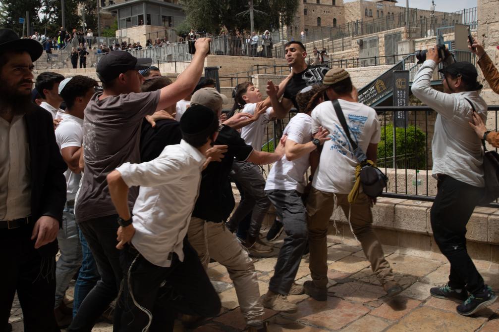 2025年5月26日,在耶路撒冷老城举行的“耶路撒冷日”游行期间,参加游行的以色列极右翼人士与一名巴勒斯坦人(中上)发生冲突。