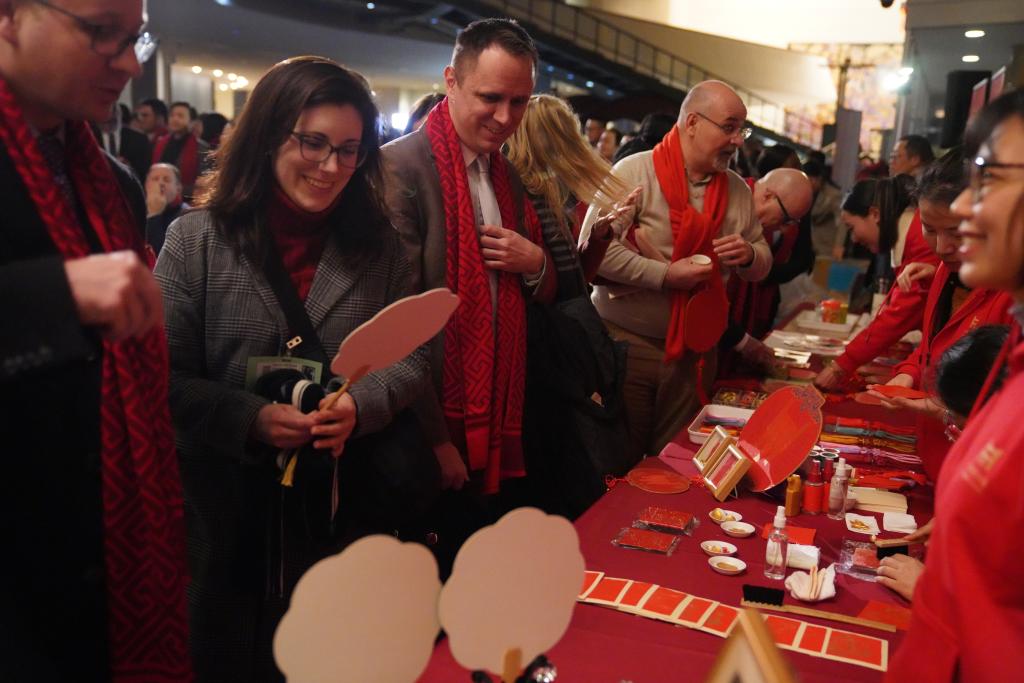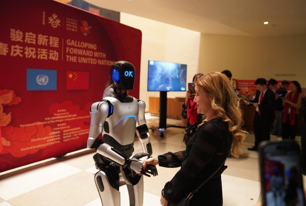 当晚,联合国总部张灯结彩,年味十足。来自上海博物馆的金鼎拓印和VR游黄浦江体验、北京文旅局和中央美术学院的全球吉庆生肖设计展,以及8台“中国智造”机器人,共同营造出传统与现代交织的喜庆氛围。各国友人切身感受到中国正加速发展,向“新”而行、以“质”致远。