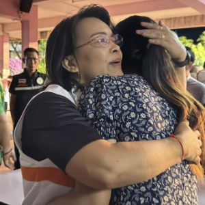 2月11日,两名女子在泰国宋卡府合艾县发生校园枪击案的学校互相拥抱。新华社发