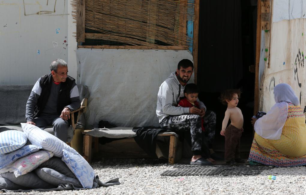 2018年4月12日,在希腊雅典以北约86公里处的里措纳难民营,一对夫妇照顾孩子。新华社发(马里奥斯·罗洛斯摄)