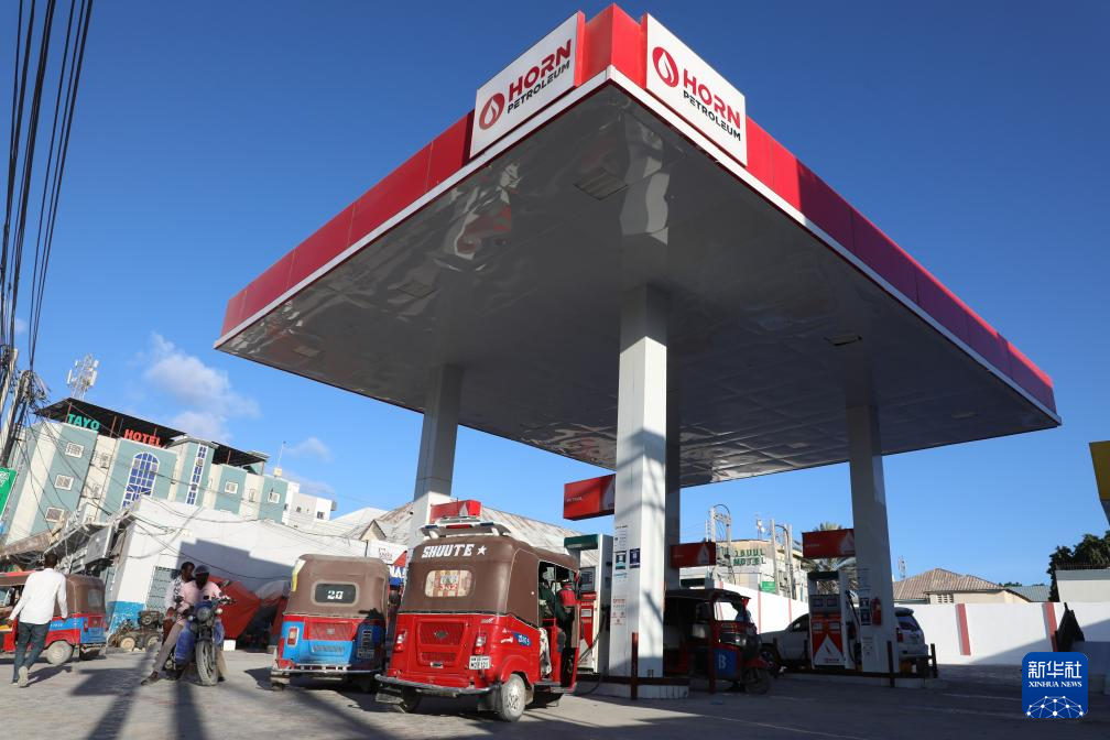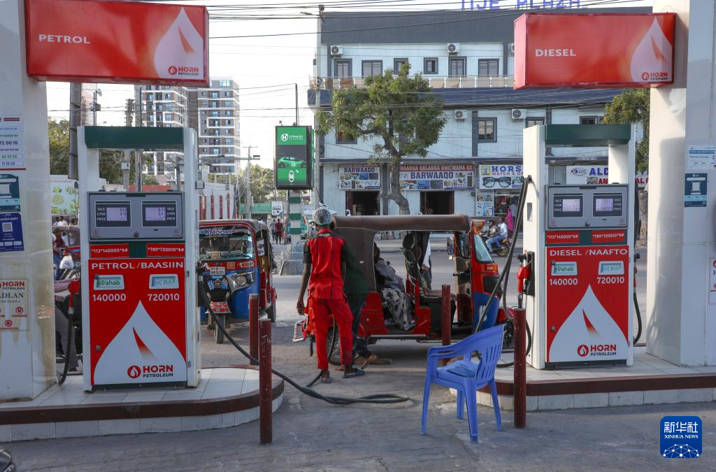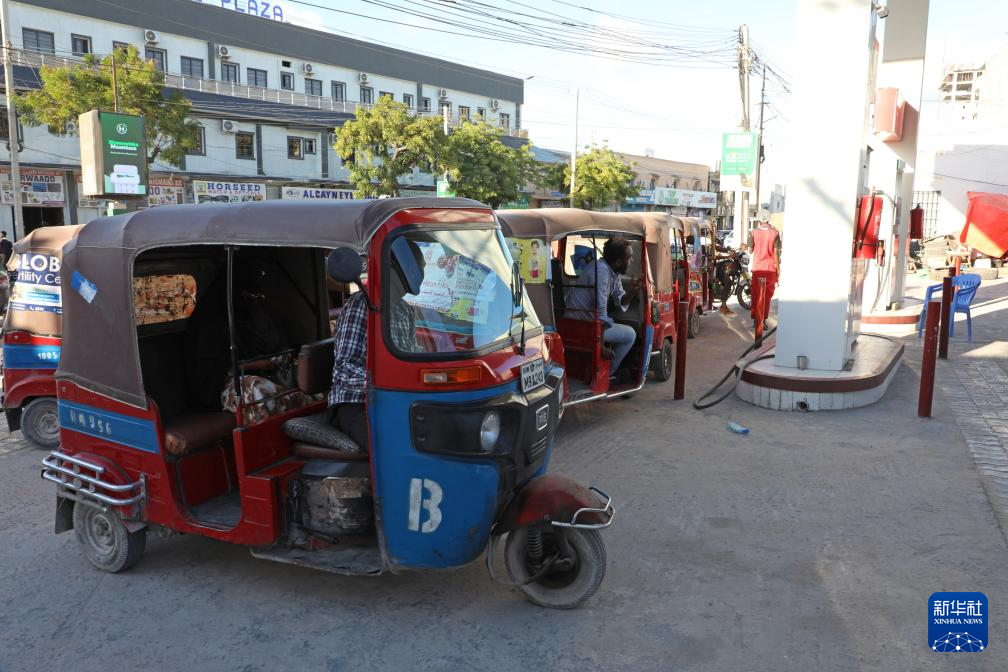 4月2日,在索马里首都摩加迪沙,三轮车在一处加油站加油。新华社发(哈桑·巴希摄)