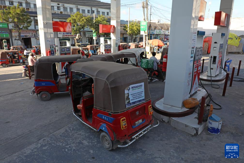 4月2日,在索马里首都摩加迪沙,三轮车在一处加油站排队等待加油。新华社发(哈桑·巴希摄)