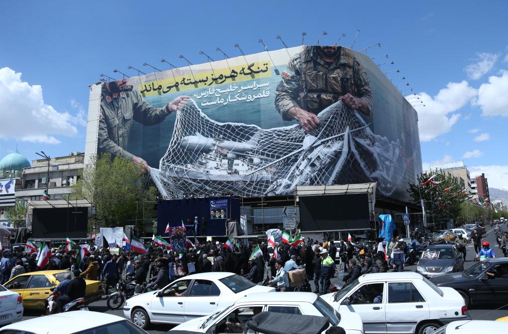 4月8日,民众在伊朗首都德黑兰革命广场参加集会。广场的大幅宣传画上描绘着伊朗武装人员的形象,文字内容是“霍尔木兹海峡仍然关闭 整个波斯湾都是我们的猎场”。新华社记者沙达提摄